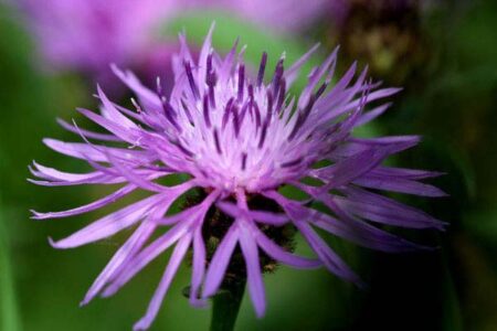 | Bijzonderheden: | Onder het paarse bloemhoofd zit een set schubben (omwindsel blad) die dakpansgewijs over elkaar liggen, zij vormen een knoopachtige structuur, lijken op een dennenkegel of gevlochten knoop, vandaar de naam. |